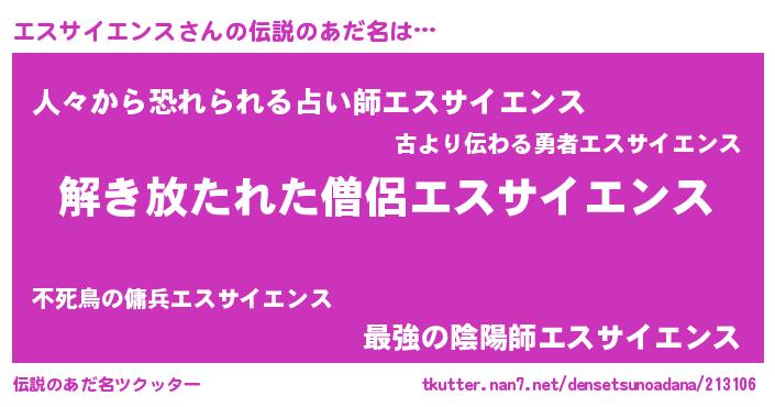| 女子向けラノベタイトル風あだ名 | 『エスサイエンスの卵を拾いまして』 |