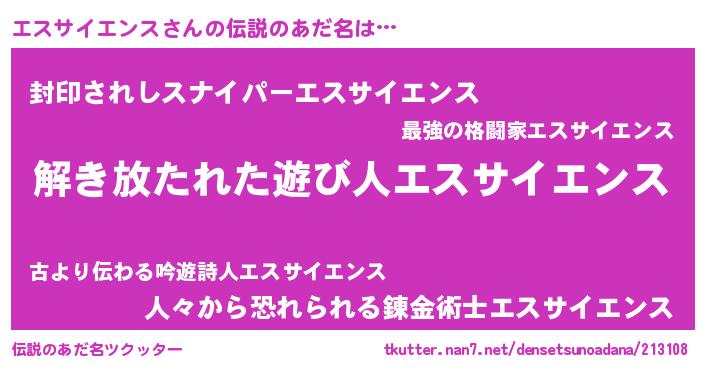 | 男性向けラノベタイトル風あだ名 | 『エスサイエンスの嫁は女の子じゃないと思った?』 |