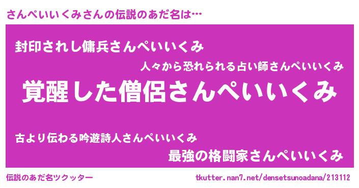 | 男性向けラノベタイトル風あだ名 | 『さんぺいいくみの嫁は女の子じゃないと思った?』 |