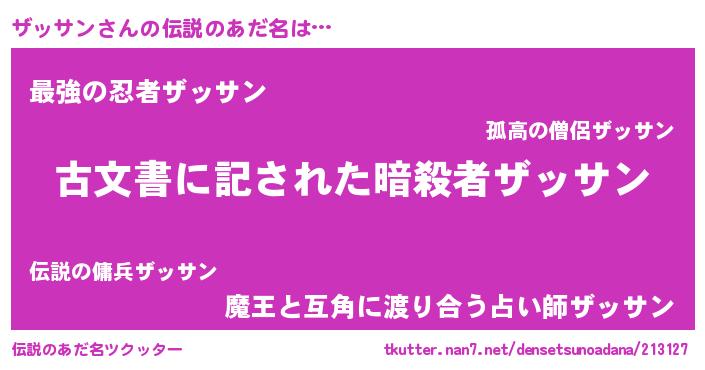 | 男性向けラノベタイトル風あだ名 | 『ザッサンに滅ぼされるだけの簡単なお仕事です』 |