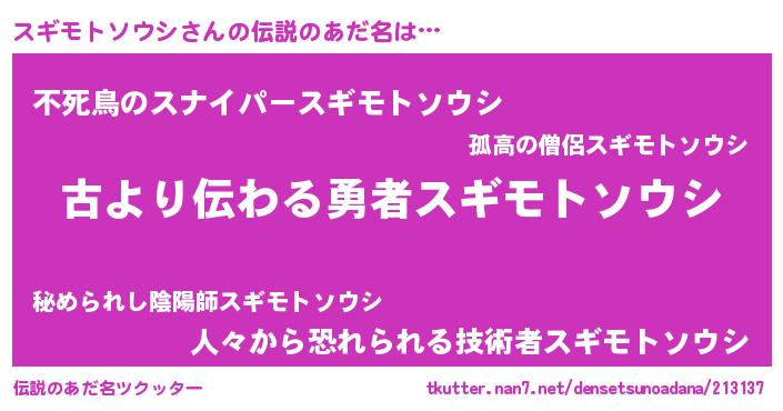 | 肩書あだ名 | 『スギモトソウシ少将』 |