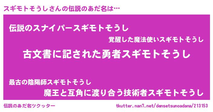 | ヒーロー風カッコイイあだ名 | 『ネオスギモトソウシ』『幻影騎士スギ』 |