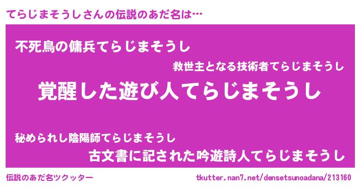 | 男性向けラノベタイトル風あだ名 | 『この素晴らしい世界にてらじまそうしを!』 |