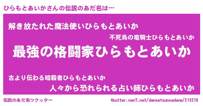 | 男性向けラノベタイトル風あだ名 | 『ひらもとあいか~年齢イコール彼女いない歴の魔法使い~』 |