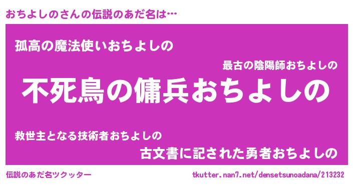 | 男性向けラノベタイトル風あだ名 | 『おちよしのに滅ぼされるだけの簡単なお仕事です』 |