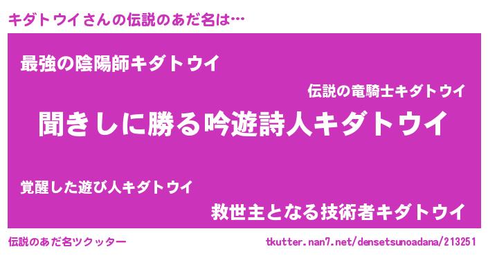 | 男性向けラノベタイトル風あだ名 | 『キダトウイという概念が存在しない退屈な世界 』 |