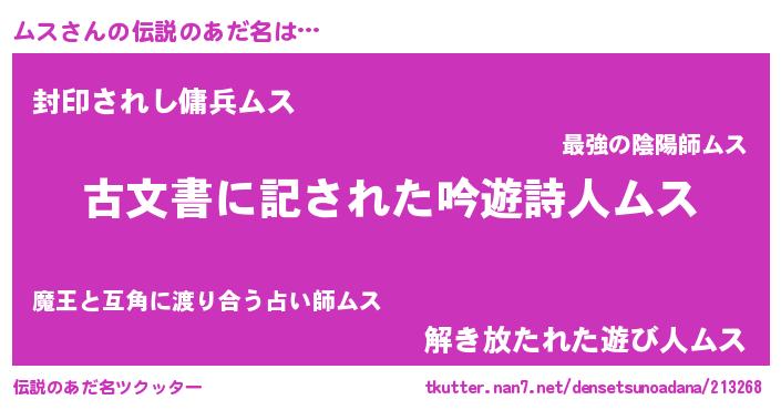 | 意味不明あだ名 | 『住所不定無職ムス(13歳)』『永久保存ムス』 |