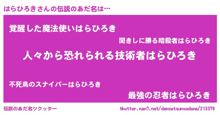 | 男性向けラノベタイトル風あだ名 | 『おまえをオタクにしてやるから、俺をはらひろきにしてくれ! 』 |