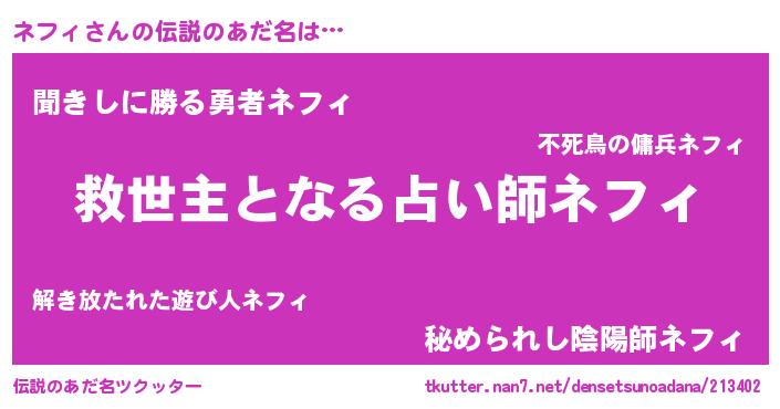 | ヘコむあだ名 | 『ネフィ(苦笑)』『牛乳』『ネフっ子』 |