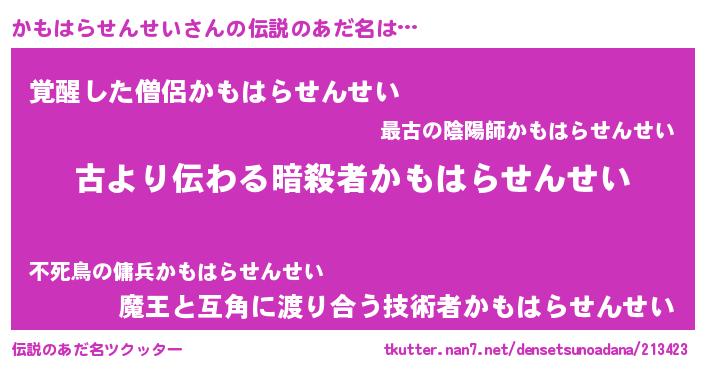 | 胡散臭い通販商品みたいなあだ名 | 『来世でも幸せになれる健康食品…その名も「かもはらせんせい」』 |