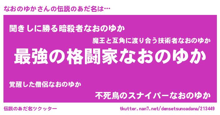 | 男性向けラノベタイトル風あだ名 | 『なおのゆか~年齢イコール彼女いない歴の魔法使い~』 |