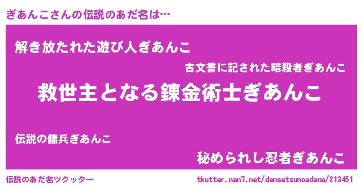 | 男性向けラノベタイトル風あだ名 | 『ノーゲーム・ノーギアンコ』 |