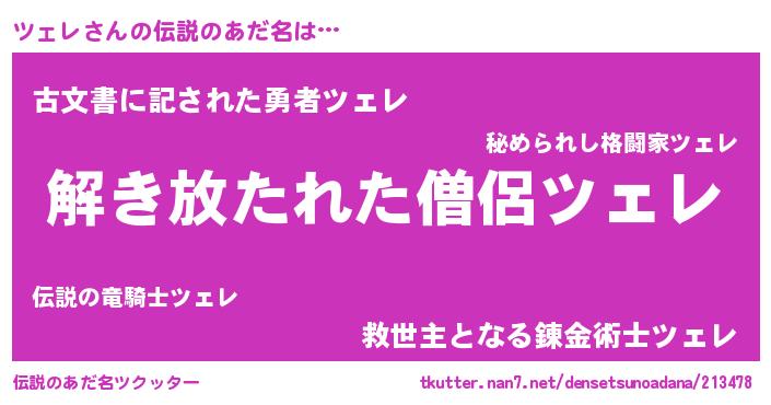 | 男性向けラノベタイトル風あだ名 | 『この素晴らしい世界にツェレを!』 |