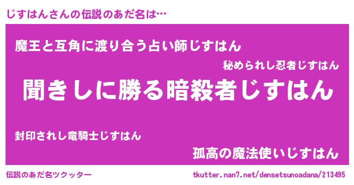 | 意味不明あだ名 | 『めかぶ科じすはん属』『自称じすはん』 |
