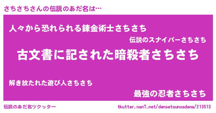 | 男性向けラノベタイトル風あだ名 | 『この素晴らしい世界にさちさちを!』 |