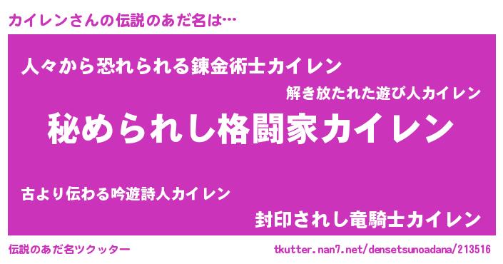 | 男性向けラノベタイトル風あだ名 | 『緋弾のカイレン』『魔弾の王とカイレン』 |