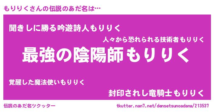 | 男性向けラノベタイトル風あだ名 | 『もりりく~年齢イコール彼女いない歴の魔法使い~』 |