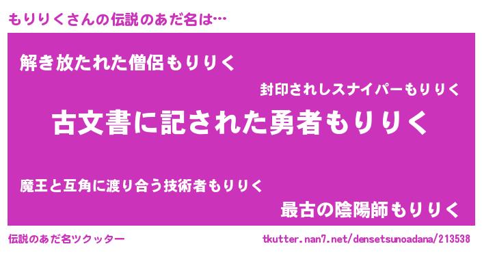 | 男性向けラノベタイトル風あだ名 | 『もりりくに滅ぼされるだけの簡単なお仕事です』 |