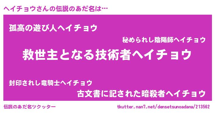 | ヒーロー風カッコイイあだ名 | 『慈愛の使者ヘイチョウ』『暗黒騎士ヘイ』 |
