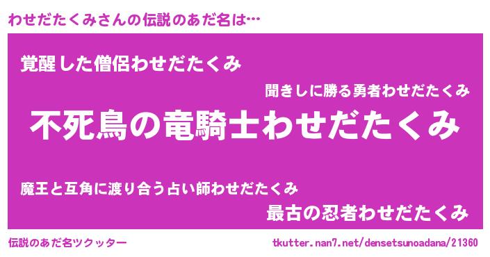 | ヒーロー風カッコイイあだ名 | 『スーパーワセダタクミ』『銀牙騎士ワセ』 |