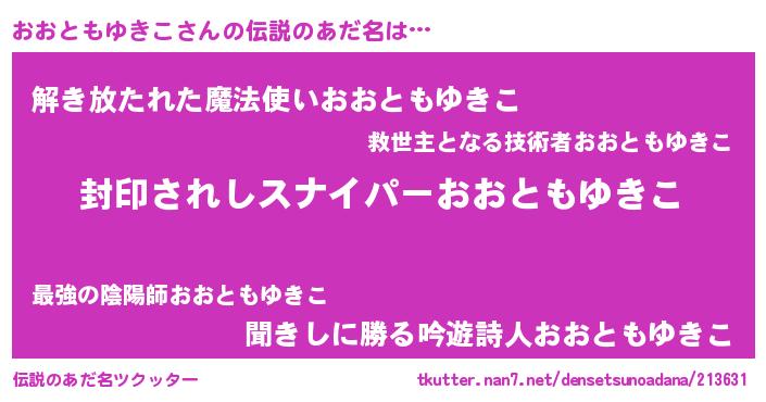 | 男性向けラノベタイトル風あだ名 | 『オオトモユキコアートオンライン』 |