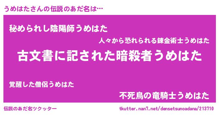 | 男性向けラノベタイトル風あだ名 | 『この素晴らしい世界にうめはたを!』 |