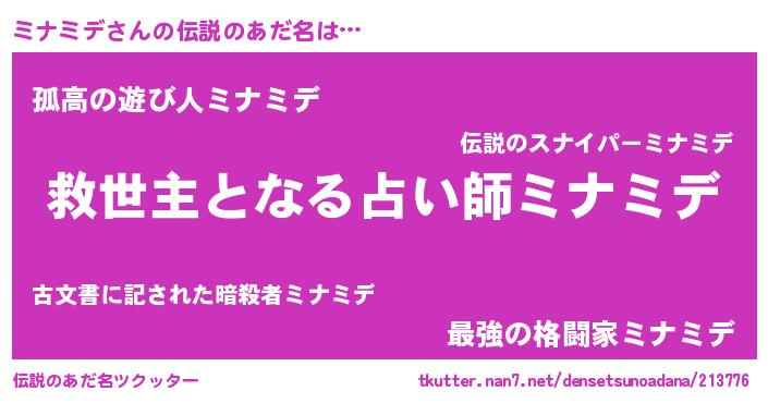 | ヒーロー風カッコイイあだ名 | 『天空の使者ミナミデ』『黄金騎士ミナ』 |