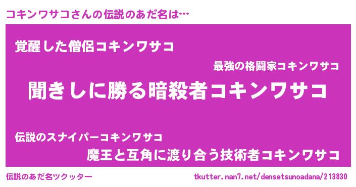 | ヒーロー風カッコイイあだ名 | 『ネオコキンワサコ』『魔戒騎士コキ』 |