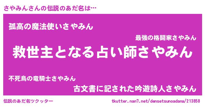 | 男性向けラノベタイトル風あだ名 | 『Re:さやみんから始める異世界生活』 |