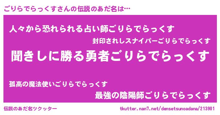 | 男性向けラノベタイトル風あだ名 | 『魔弾の王とごりらでらっくす』 |