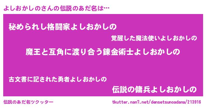 | 男性向けラノベタイトル風あだ名 | 『よしおかしのに滅ぼされるだけの簡単なお仕事です』 |