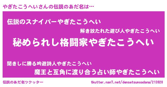 | 意味不明あだ名 | 『住所不定無職やぎたこうへい(6歳)』 |