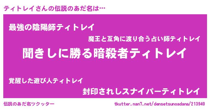 | 意味不明あだ名 | 『永久保存ティトレイ』『自称ティトレイ』 |