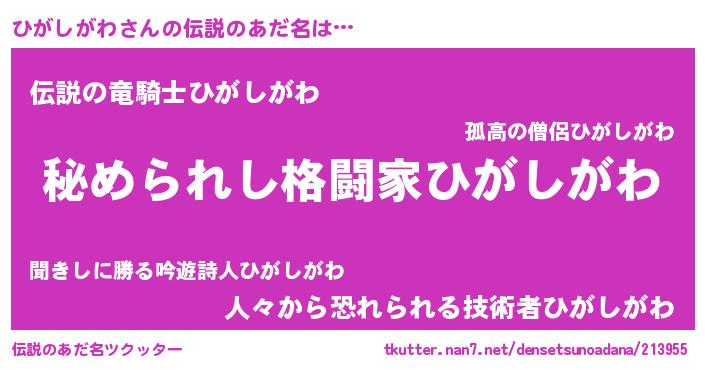 | 男性向けラノベタイトル風あだ名 | 『魔弾の王とひがしがわ』 |