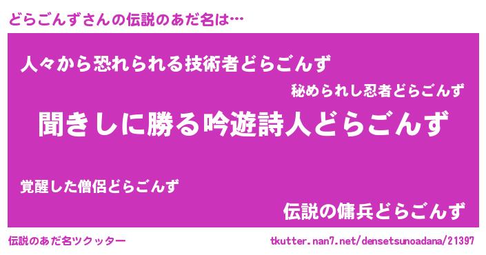 | 男性向けラノベタイトル風あだ名 | 『どらごんずという概念が存在しない退屈な世界 』 |
