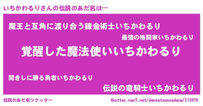 | 男性向けラノベタイトル風あだ名 | 『いちかわるり~年齢イコール彼女いない歴の魔法使い~』 |