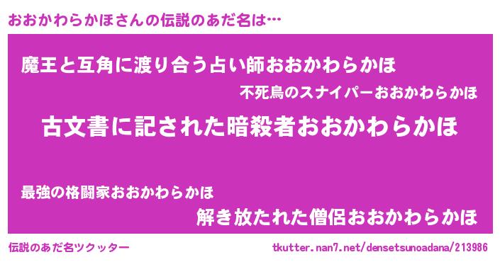 | ヒーロー風カッコイイあだ名 | 『ネオオオカワラカホ』『魔戒騎士オオ』 |