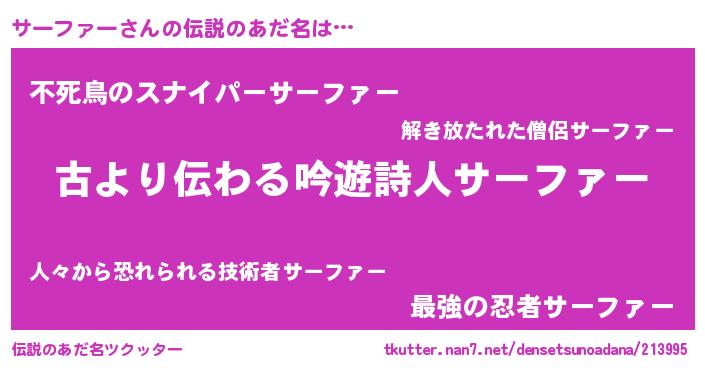 | 男性向けラノベタイトル風あだ名 | 『サーファーという概念が存在しない退屈な世界 』 |