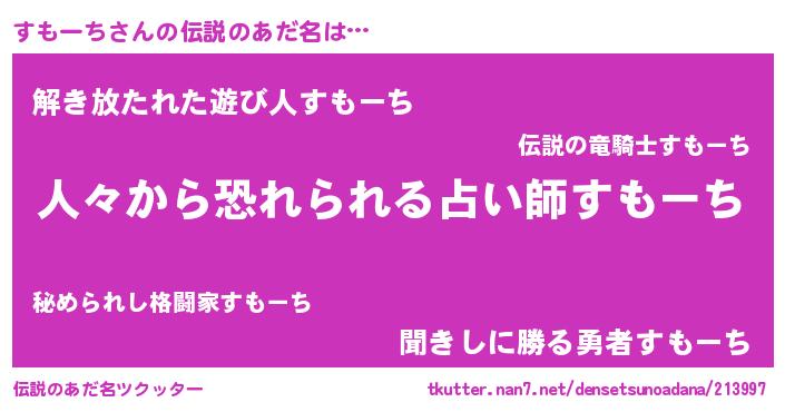 | 男性向けラノベタイトル風あだ名 | 『おまえをオタクにしてやるから、俺をすもーちにしてくれ! 』 |
