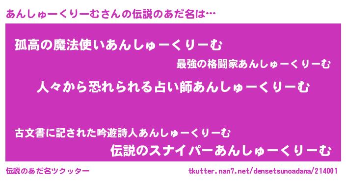 | ヒーロー風カッコイイあだ名 | 『正義の使者あんしゅーくりーむ』 |