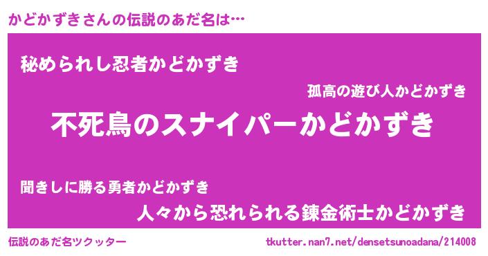 | 男性向けラノベタイトル風あだ名 | 『かどかずきに滅ぼされるだけの簡単なお仕事です』 |