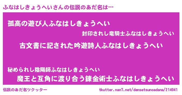 | 男性向けラノベタイトル風あだ名 | 『この素晴らしい世界にふなはしきょうへいを!』 |