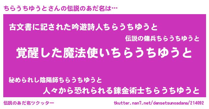 | 男性向けラノベタイトル風あだ名 | 『ちらうちゆうとの嫁は女の子じゃないと思った?』 |