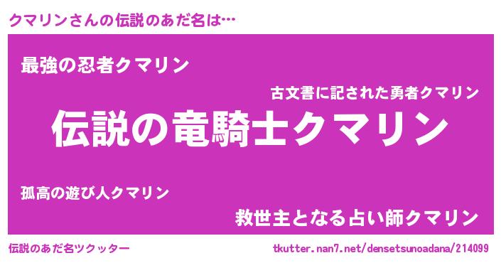 | ファンタジー風あだ名 | 『クマフェル』『エターナルクマリンー』 |