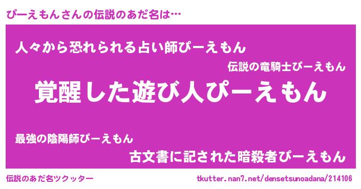 | 男性向けラノベタイトル風あだ名 | 『ぴーえもんの嫁は女の子じゃないと思った?』 |
