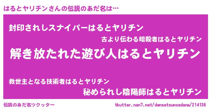 | ヒーロー風カッコイイあだ名 | 『銀牙騎士ハル』『ネオハルトヤリチン』 |