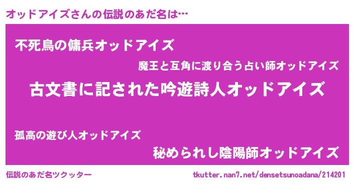 | 男性向けラノベタイトル風あだ名 | 『オッドアイズ~年齢イコール彼女いない歴の魔法使い~』 |