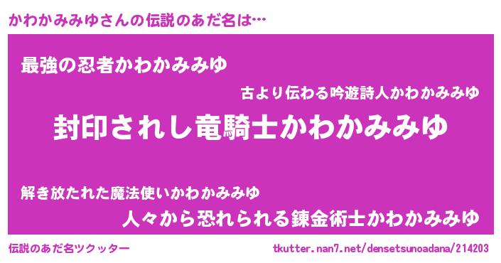 | 男性向けラノベタイトル風あだ名 | 『この素晴らしい世界にかわかみみゆを!』 |