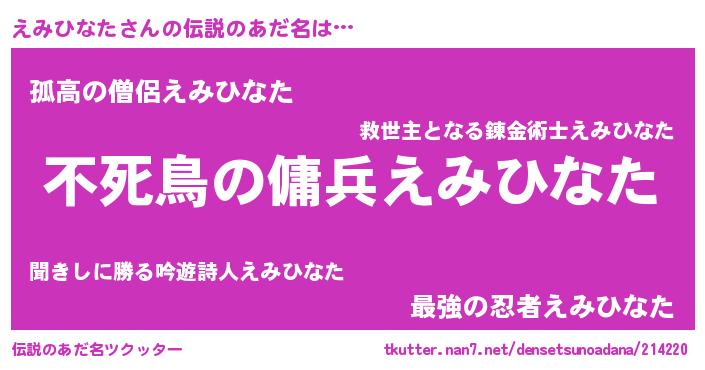 | 意味不明あだ名 | 『住所不定無職えみひなた(56歳)』 |