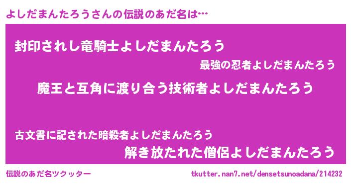 | 意味不明あだ名 | 『住所不定無職よしだまんたろう(1歳)』 |